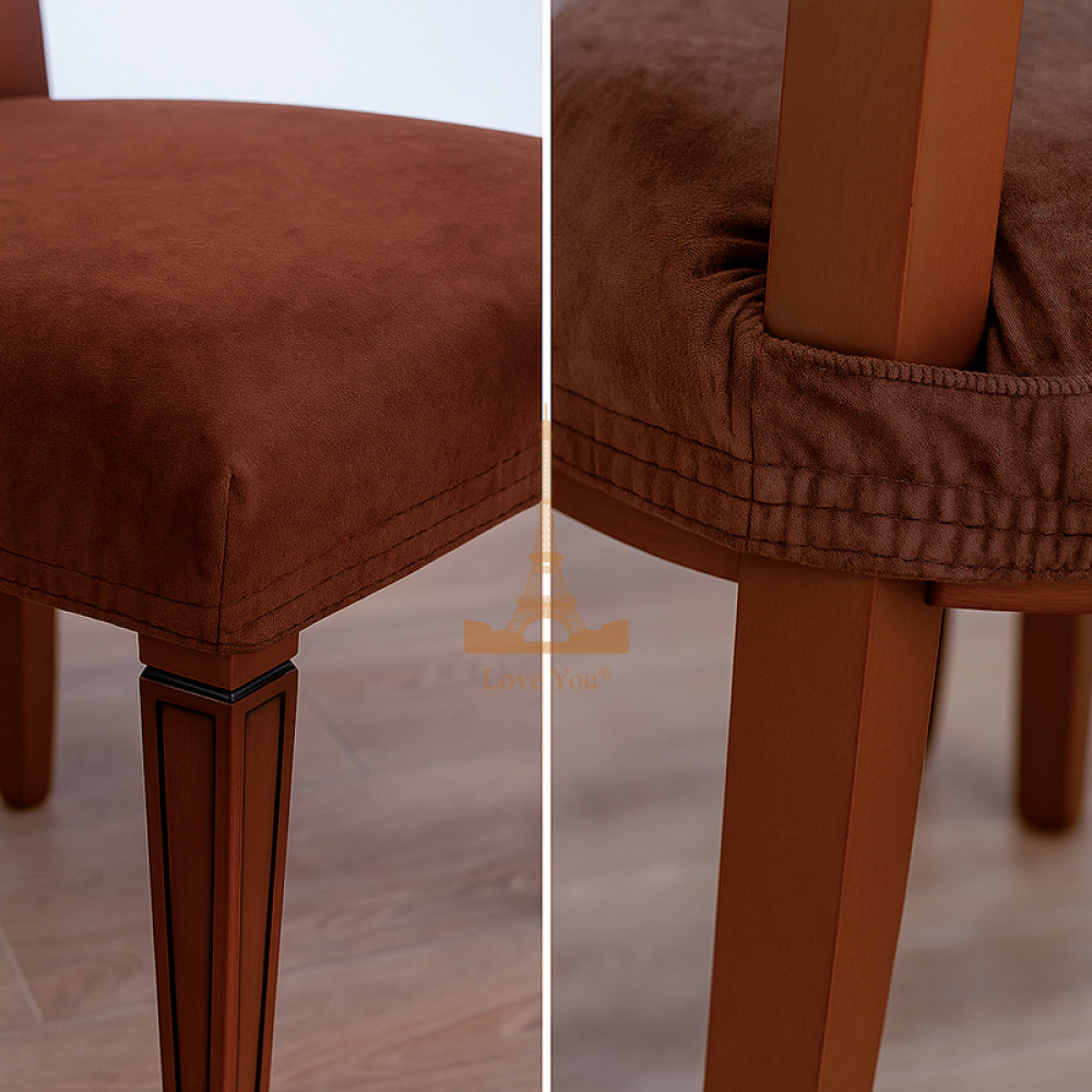Еластичний чохол на стілець з велюру — стильне та практичне рішення для оновлення меблів. М’який матеріал приємний на дотик, щільно облягає сидіння та захищає його від плям, пилу й зношування.