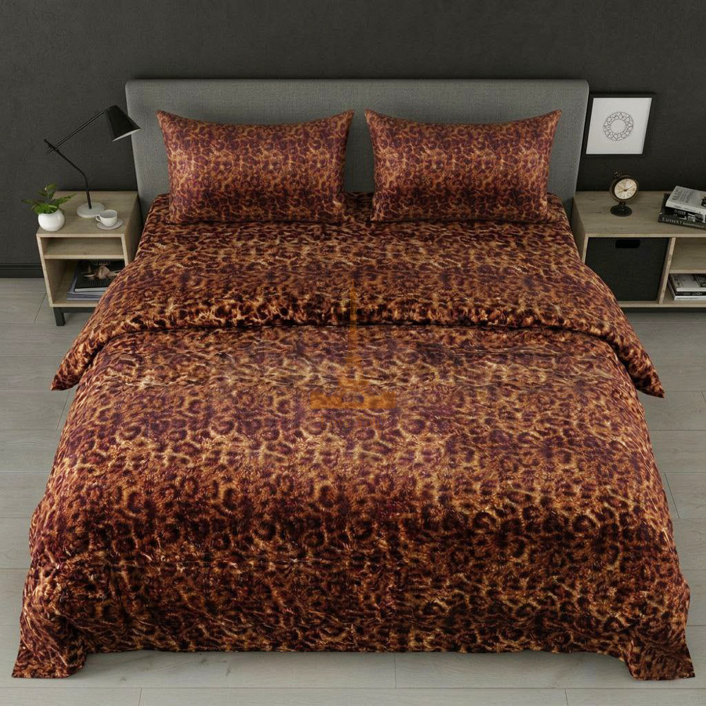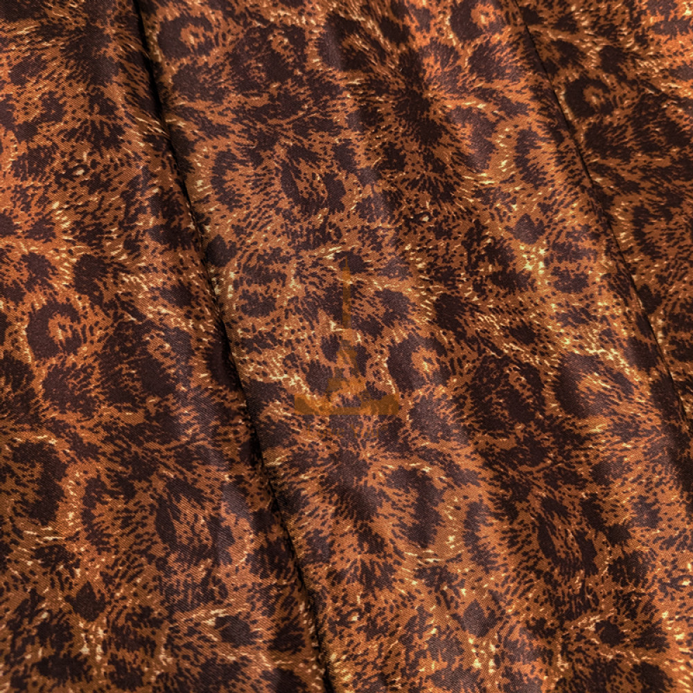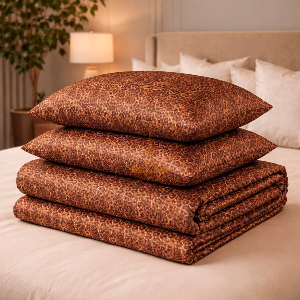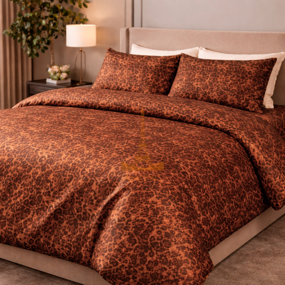 Розкішний комплект постільної білизни з анімалістичним візерунком у теплих коричнево-золотистих відтінках. Тканина має делікатний блиск і ефект переливання, що додає інтер’єру глибини та елегантності.