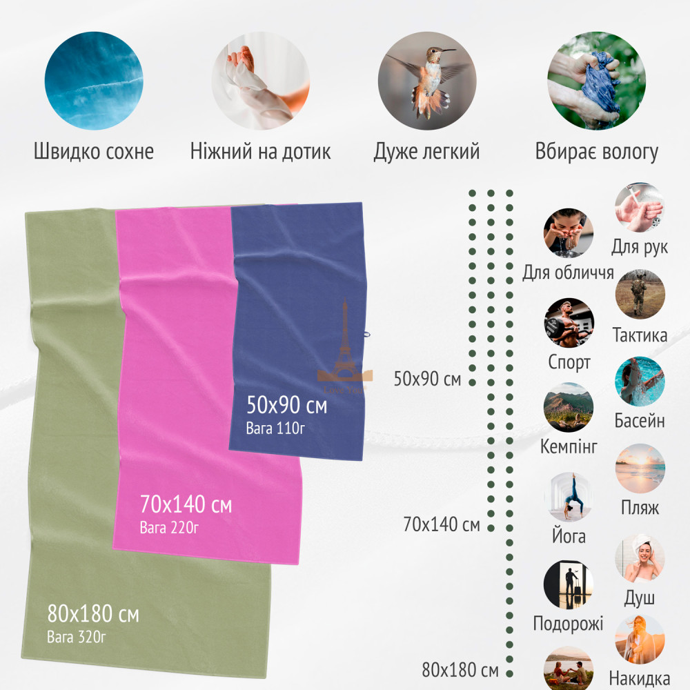 80x180 см: Великий рушник, який підходить для використання на пляжі як лежак або після купання. Через його розмір, він також може бути використаний для пікніків або йоги на відкритому повітрі.